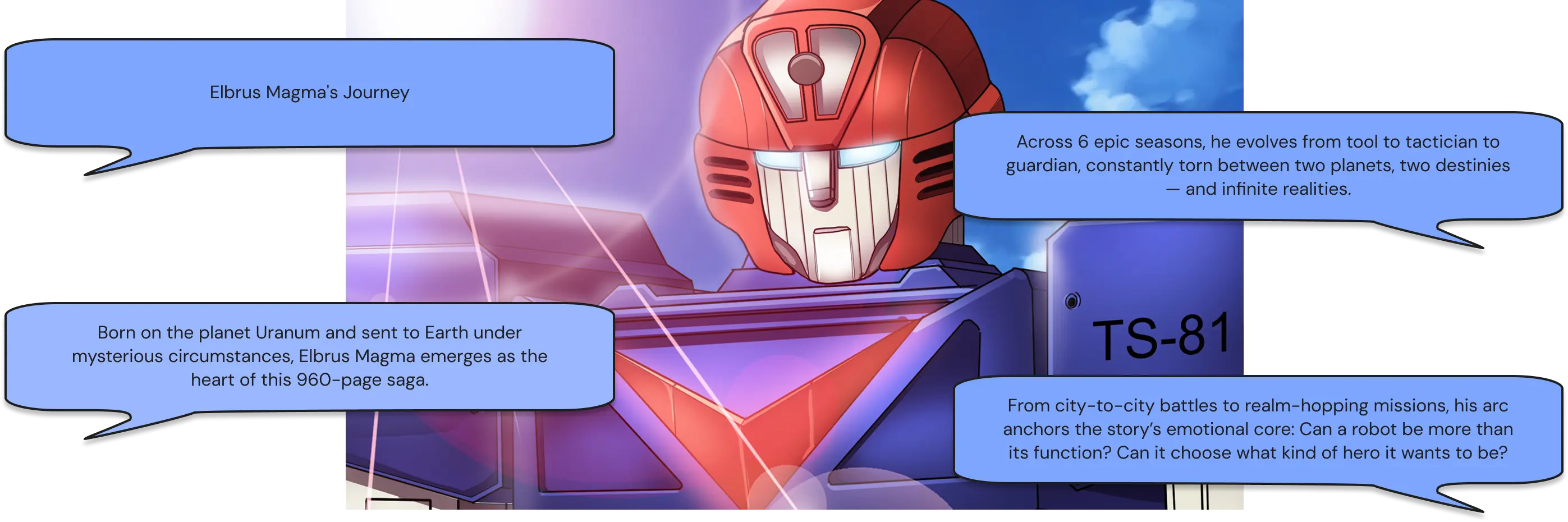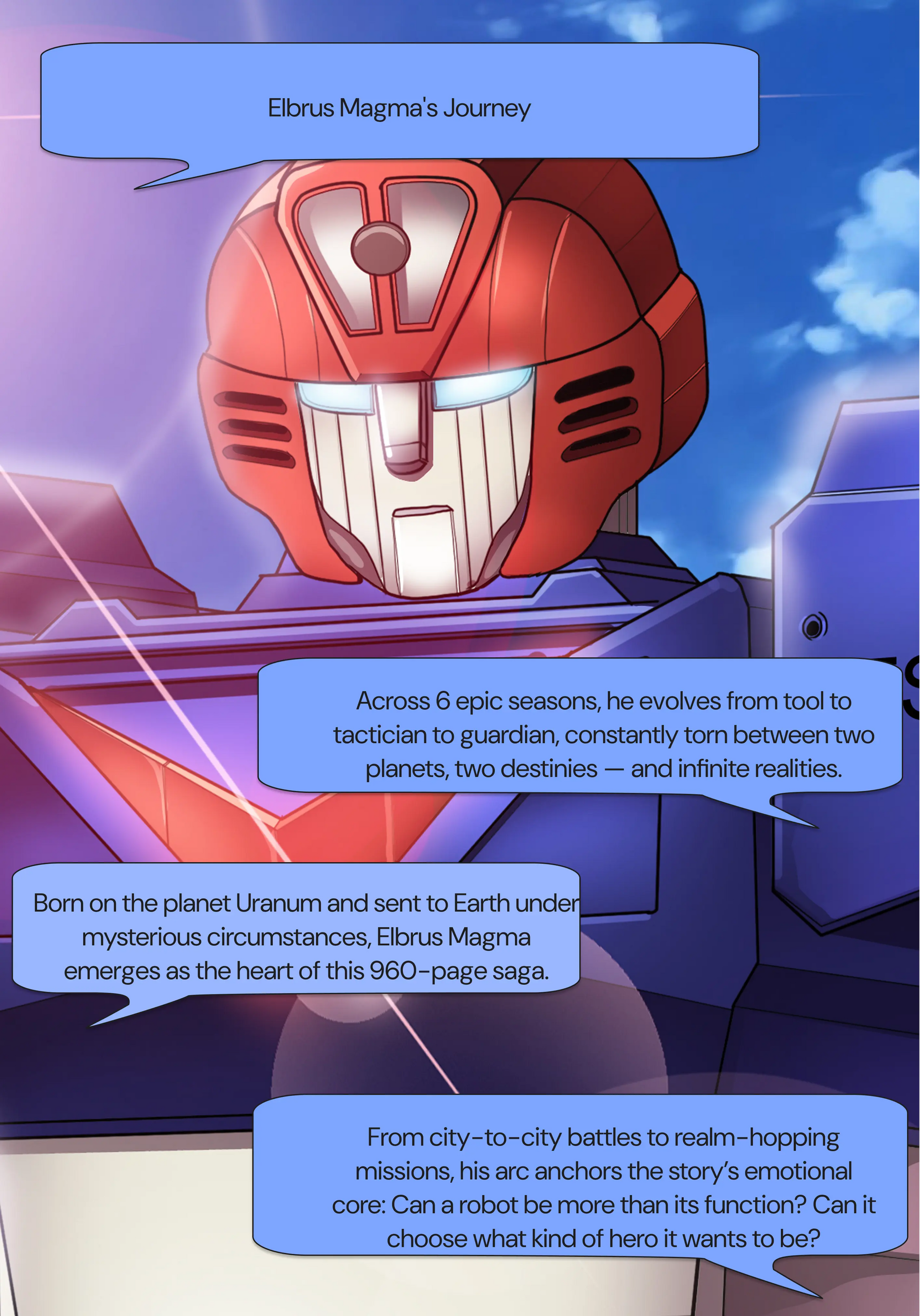 Over 6 epic seasons and 960 pages, witness the odyssey of Elbrus Magma — a humanoid warrior from the planet Uranum, sent to protect Earth. From interplanetary wars to battles against unseen threats, Elbrus fights for humanity’s survival — no matter the cost.